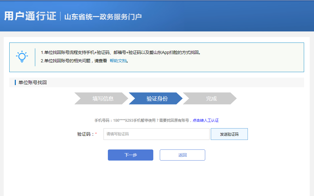 3. 在验证身份环节涉及到三种验证方式:手机号+验证码方式、邮箱+验证码方式、爱山东APP扫脸认证。