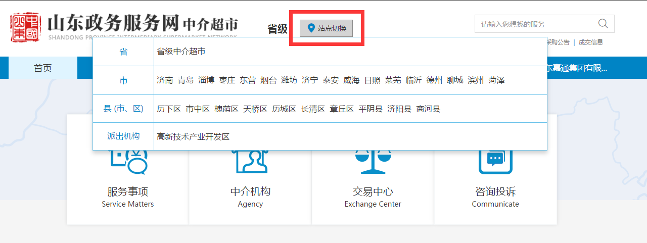 中介超市属于省级部署省、市、县三级使用,不同地区的用户点击“站点切换”选择正确的站点即可(如图1)