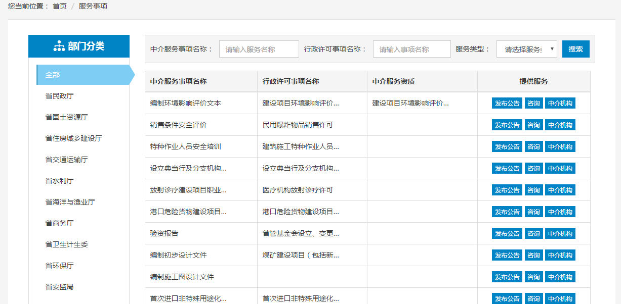 “服务事项”展示梳理的全省中介服务事项信息,根据所选的站点过滤,公众可以浏览查看相关信息(如图2),采购人可以通过“发布公告”快捷入口针对中介服务事项、行政许可事项、中介服务资质来快捷发布公告(如图3),也可通过“咨询”按钮向中介服务事项对应的中介机构和业务主管部门进行咨询(如图4),也可以通过“中介机构”快捷入口查看中介服务事项、行政许可事项、中介服务资质所对应的中介机构(如图5)。