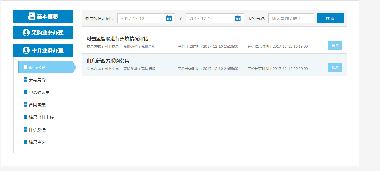 采购人和中介服务机构可以通过“提交”快捷按钮对处于报名中、竞价中以及成交信息进行查看,查询时可以通过项目名称、行政区划、事项名称进行查询(如图12)