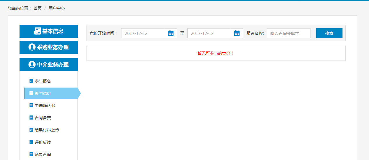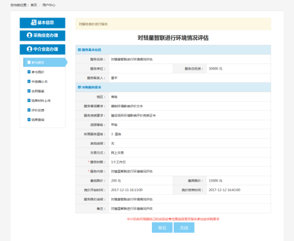 用户登陆后可以在首页中查看已经发布的公告信息(如图1),在报名截至日期之前可以在首页中即可点击公告信息并进行报名(如图2),也可以在用户中心中点击左侧菜单“中介业务办理”图标下的“参与报名”,查看正在报名中的公告信息(如图3)并对想参与的中介服务事项进行报名(如图4)。