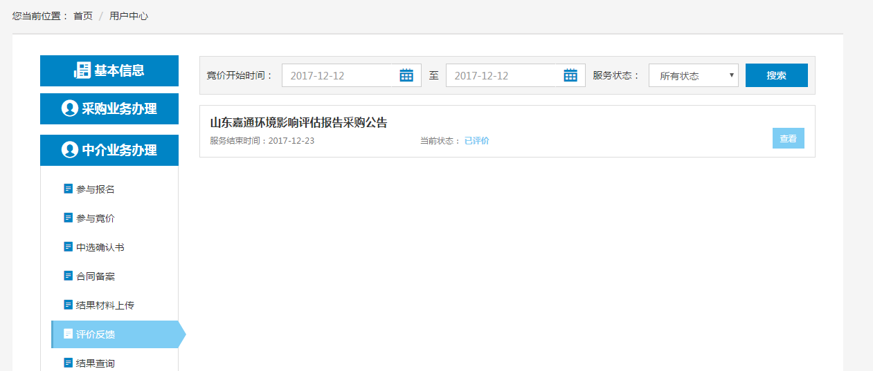“用户中心”页面分角色提供采购人与中介机构的操作功能。采购人进行采购公告发布并确认公告的报名与竞价情况,对服务进行咨询评价。中介机构参与报名竞价确认中选并上传合同及结果材料及对采购人提出的服务评价进行反馈(如图5)。